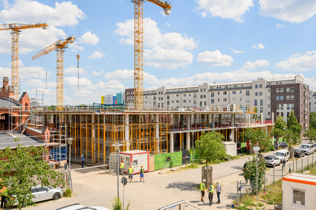 Now that we are above ground with the construction work, the new office building is growing steadily and you can already see how impressive it will be. The lobby on the corner of Otto-Ostrowski-Str. is already rising impressively into the sky. In parts the ceiling heights in the building are 4.5m. During the last weeks and months, work has mainly been done on the completion of the shell of the building in the basements. Now the floor of the ground floor is already being completed. Other construction started by pulling out the beams of the shoring. A mobile crane was needed for this.