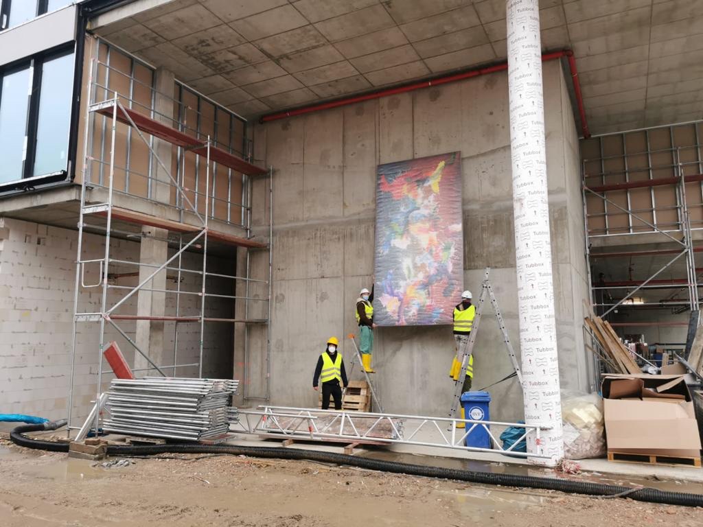 At the end of last year, we agreed to cooperate with Christian Awe. At a first joint on-site appointment in mid-January, the aim was to sound out the right proportions as well as the spatial and colour effects on site. The installation of the works painted especially for DSTRCT.Berlin in the future lobbies will thus create an exciting combination of painting and architecture.