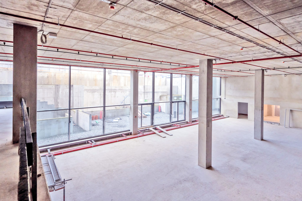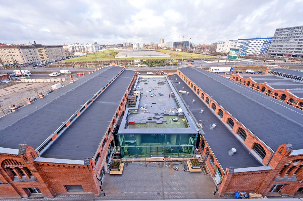 The core and shell of three of the four historic halls and the new building are almost complete. As soon as individual requirements, floor plans and design have been agreed with the future tenants, the interior fit-out tailored to the tenants will begin.