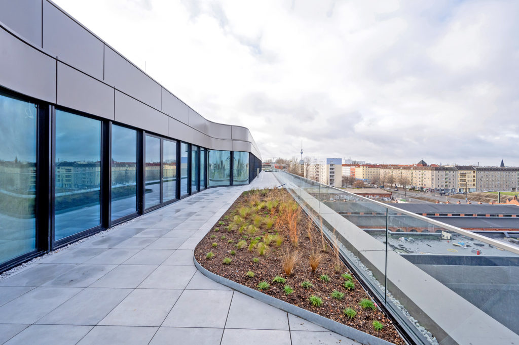 The roof top terrace is finished. The flooring, the greenery, all doors and window elements as well as the all-round glass railing have been installed. The future tenants will be able to enjoy sunny hours and a nice view to the TV tower.