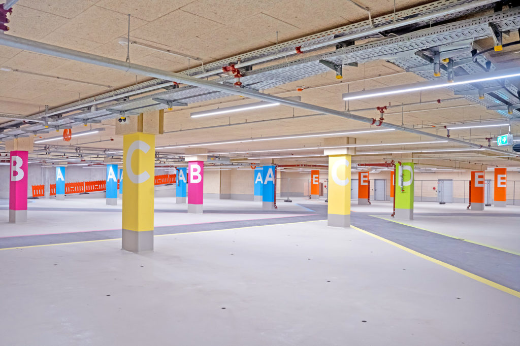 The Drive-In underground bicycle garage has a total of 832 parking spaces. To ensure that everyone can find their bike quickly and easily, the bicycle garage is divided into six segments, which are marked in colour and from A to F. The parking spaces are divided into two segments.