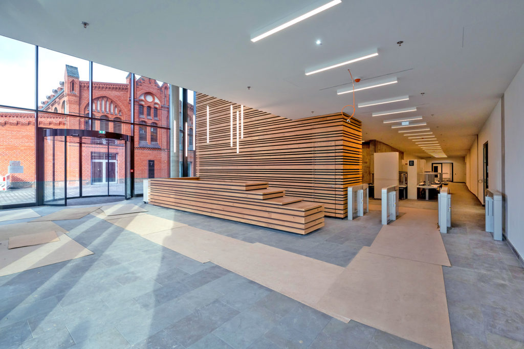Even before the employees of our first tenant STRATO move into their new offices, we have ventured a look into the still unfinished rooms for you and captured a few impressions. The spacious entrance area is graced by a huge wooden element several metres high.