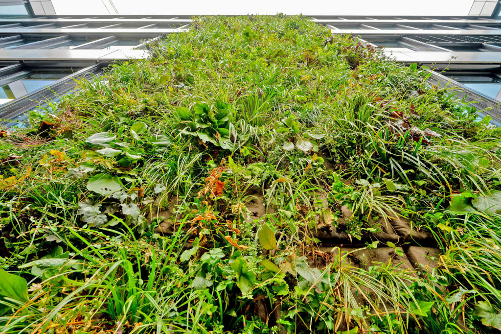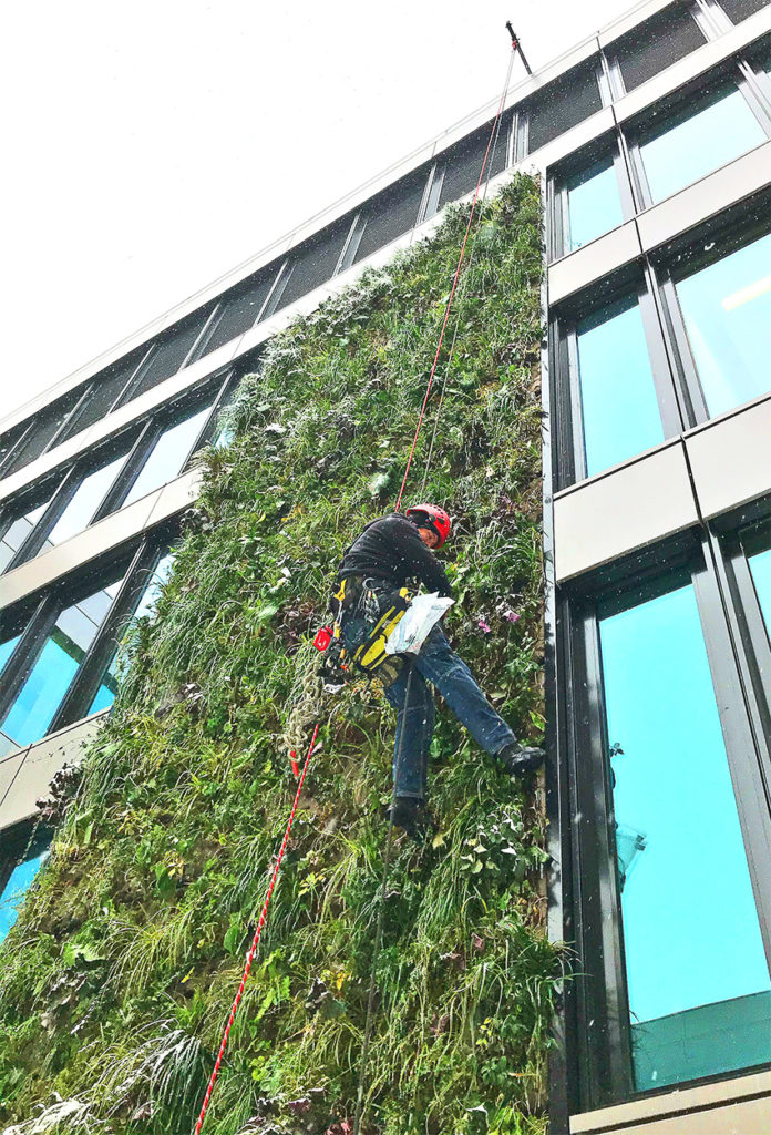 An intelligent watering system is hidden behind the green façades. The automatic control system is located on the 5th floor and constantly measures the humidity, temperature, pressure and flow rate in the countless sensors on and in the panels as well as the wall and reacts autonomously. In this way, water is automatically applied as needed, whereby more water is applied at the top than at the bottom, since gravity means that the water naturally finds its way down anyway. In addition, the pipes automatically empty themselves when frost temperatures are imminent to prevent frost damage.