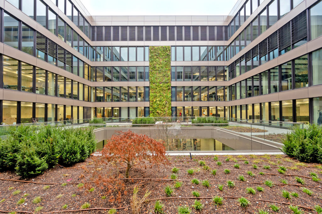 The three generous inner courtyards are now graced with a total of four green facades with 1,800 real plants. This green plant dress extends to a height of 13 metres and a width of 3.70 metres. Each of the four vertical green facades is just under 50 square metres in size. This makes almost 200 square metres of green space on the walls.