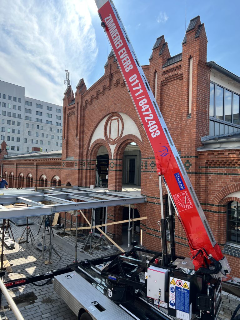 A highlight of the last few weeks was the delivery and installation of a custom-made staircase for the tenant AWIN, which leads to the roof terrace of the intermediate building of the old halls. On a Tuesday in May, the staircase, which was manufactured in Poland and weighed in at 9 tonnes, was delivered and lifted by crane from Otto-Ostrowski-Str. over the adjacent hall around noon and fitted into place with millimetre precision.