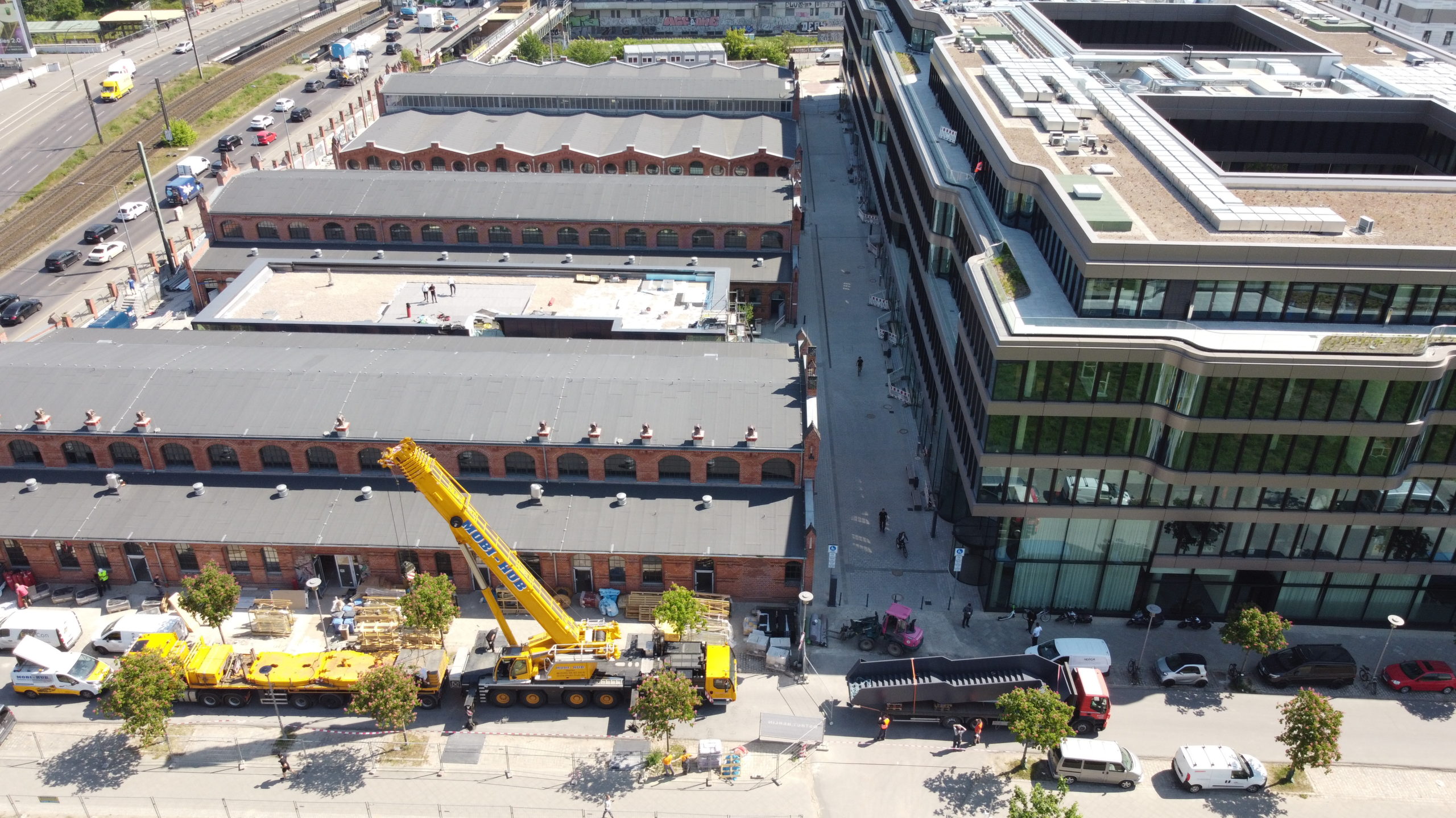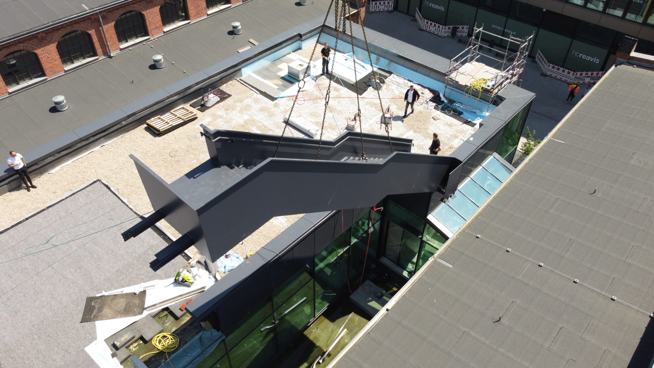 A highlight of the last few weeks was the delivery and installation of a custom-made staircase for the tenant AWIN, which leads to the roof terrace of the intermediate building of the old halls. On a Tuesday in May, the staircase, which was manufactured in Poland and weighed in at 9 tonnes, was delivered and lifted by crane from Otto-Ostrowski-Str. over the adjacent hall around noon and fitted into place with millimetre precision.