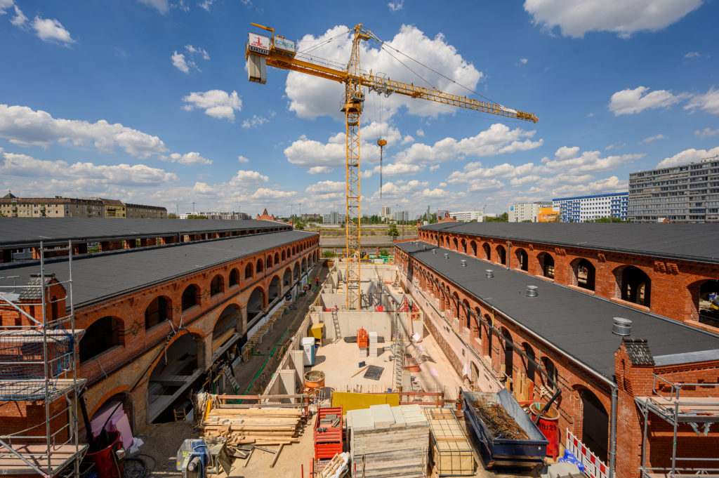 Mit Fertigstellen der Fassaden- und Dacharbeiten werden nun allmählich die Gerüste um die Hallen verschwinden und damit den Blick auf die außergewöhnlich schönen und charismatischen Backsteingebäude freigeben. Hier wurde mit viel Geduld und Detailarbeit der Ursprungszustand wieder hergestellt und eine Basis für die einzigartigen Büros gelegt, die hier entstehen werden.