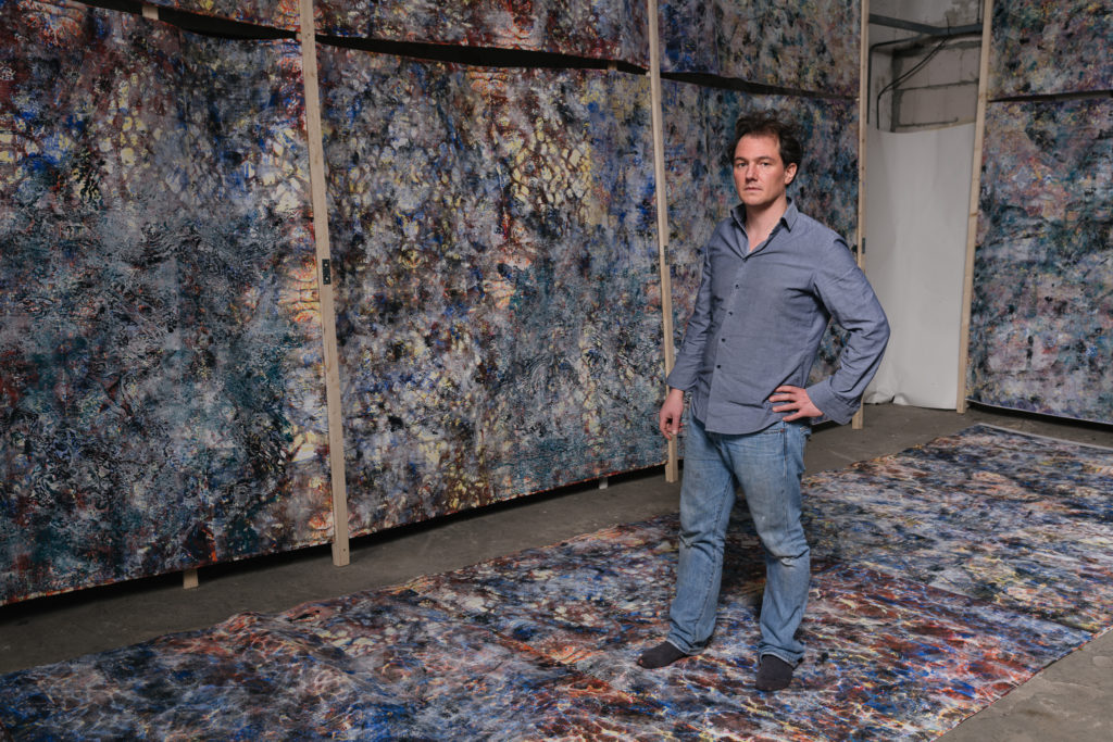 Martin Werthmann arbeitet mit großflächigen Farbholzschnitten und erstellt damit neben Stücken für Ausstellungen auch Bühnenbilder. Seine nächste Ausstellung bzw. Installation “Die Katastrophe als Raum” findet ab Dezember in München in der Galerie Heldenreizer statt. Daran arbeitet er in seinem vorübergehenden Atelier hier vor Ort.