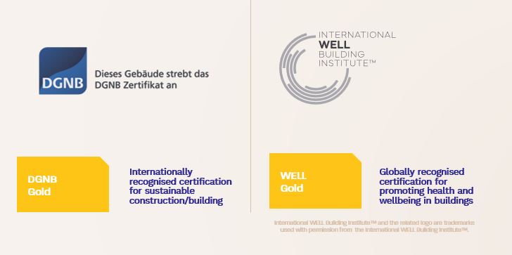 The New Building has already been registered and precertified for WELL Gold, verifying the quality of space and its ability to positively impact wellbeing and productivity. Moreover our sustainable approach is also registered with DGNB to achieve Gold status. So this building is already internationally recognized and awarded. That fills us with pride. Because we do believe that just like home isn’t just your flat, work isn’t just an office. And we are happy for you to work, eat and meet here.